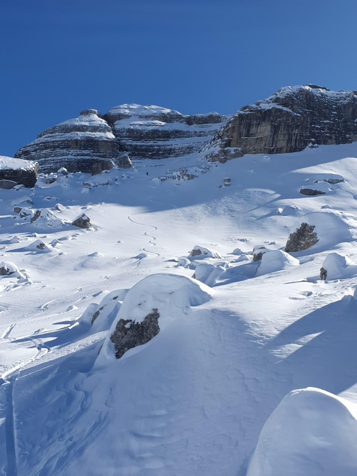 Ci si abbassa tra roccioni e valloncelli fino a raggiungere la zona sotto la Cascata della Principessa. Qui si mettono le pelli di foca e si inizia la progressiva risalita con un traverso di circa 40 minuti che conduce al Rifugio Tuckett (chiuso nel periodo invernale).