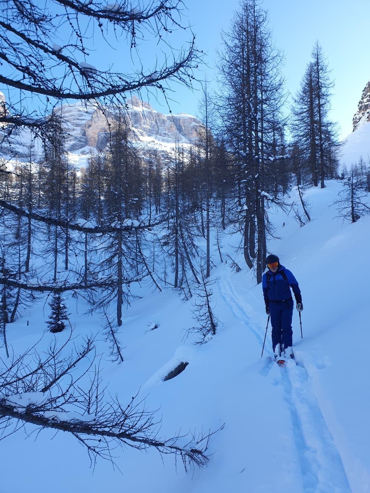 Da qui, un tranquillo traverso lungo la strada forestale riporta in paese, chiudendo una gita completa, tecnica e di grande soddisfazione, da affrontare solo con buon livello sciistico e adeguata esperienza in ambiente alpino.